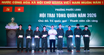 Tại chương trình, lãnh đạo phường đã tuyên dương các thanh niên tình nguyện viết đơn lên đường nhập ngũ; trao quà chúc mừng các thanh niên trúng tuyển năm 2026; đồng thời trao giải cho các tiểu trại đạt thành tích xuất sắc trong các phần thi và giải toàn đoàn Hội trại tòng quân năm 2026.
