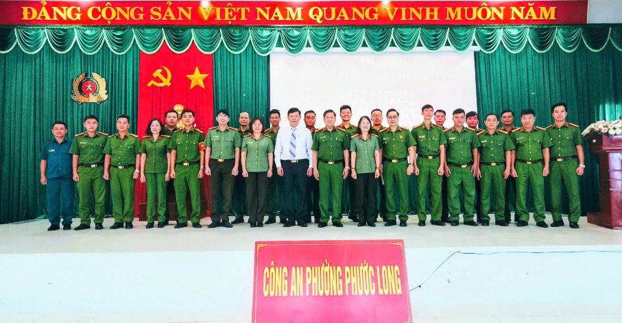 Các đồng chí lãnh đạo, đại biểu chụp hình lưu niệm với Ban chỉ huy, cán bộ, chiến sĩ Công an phường Phước Long