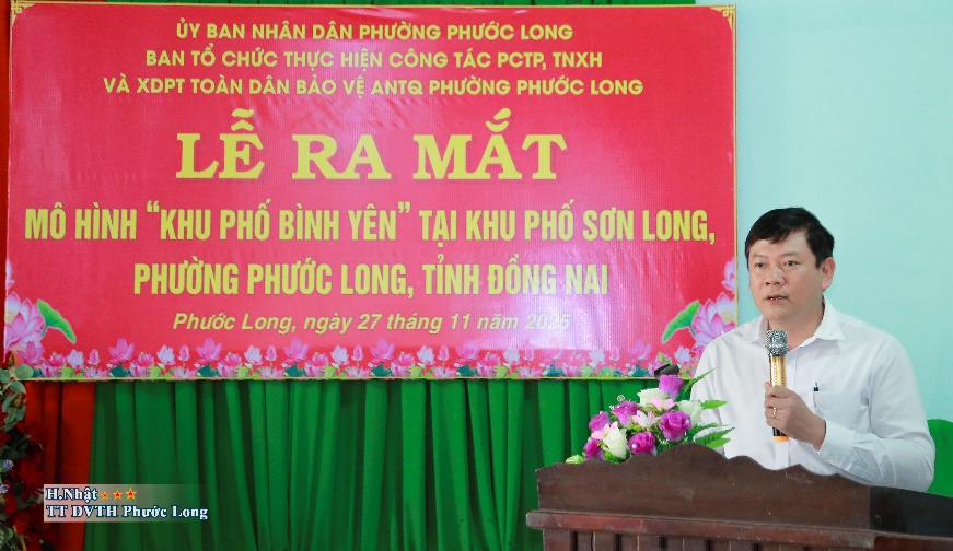 Dự và phát biểu, đồng chí Nguyễn Khắc Hạnh, Phó Bí thư Đảng ủy, Chủ tịch UBND, Trưởng Ban tổ chức thực hiện công tác PCTP, TNXH và XDPT toàn dân bảo vệ an ninh Tổ quốc phường Phước Long chúc mừng mô hình mới được thành lập và ra mắt, thời gian tới sẽ trở thành điểm sáng, lan tỏa và nhân rộng đến các khu phố trong toàn phường. Đồng chí Nguyễn Khắc Hạnh nhấn mạnh việc xây dựng mô hình “Khu phố bình yên” là một trong những giải pháp trọng tâm nhằm thực hiện có hiệu quả chủ trương xây dựng phường Phước Long đạt chuẩn “an toàn về an ninh trật tự”, mong muốn người dân khu phố Sơn Long tích cực hưởng ứng và tham gia mô hình.