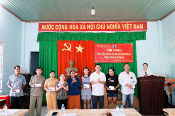 Đồng chí Dương Văn Vịnh, Đảng ủy viên, Phó Chủ tịch Thường trực UBMTTQVN, Chủ tịch Hội nông dân phường Phước Long trao quà cho các hộ dân thuộc diện khó khăn của Khu phố Sơn Long