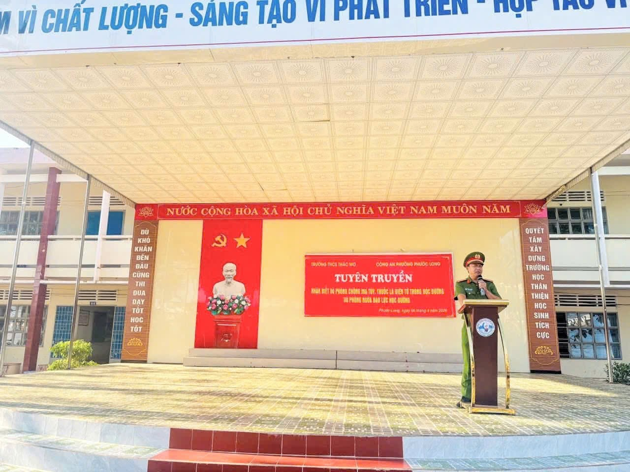 Nhằm tăng cường công tác tuyên truyền, giáo dục pháp luật cho học sinh, góp phần xây dựng môi trường học đường an toàn, lành mạnh, Công an phường Phước Long đã phối hợp với Trường THCS Thác Mơ tổ chức buổi tuyên truyền về phòng, chống ma túy, thuốc lá điện tử và bạo lực học đường. Buổi tuyên truyền thu hút sự tham gia của gần 1.200 cán bộ, giáo viên và học sinh nhà trường.