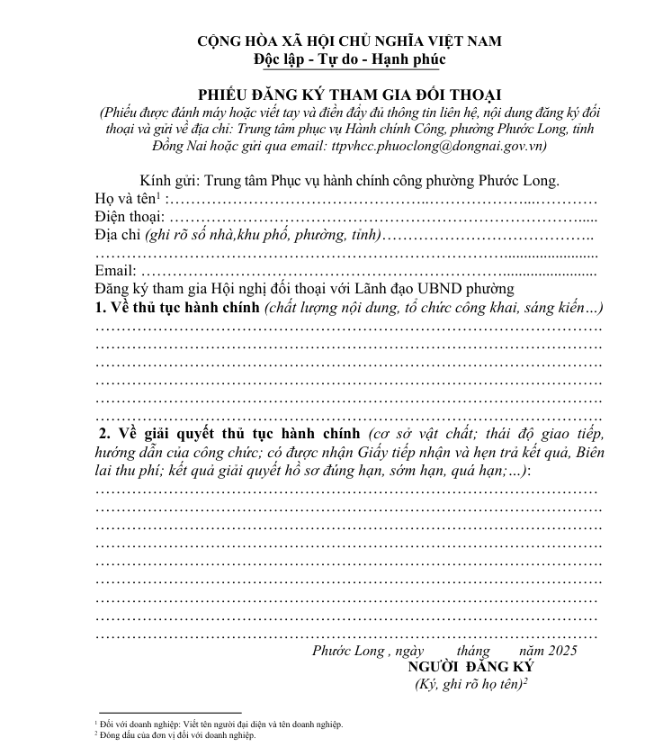 Cách thức tổ chức: Cá nhân, tổ chức tham gia đăng ký đối thoại trực tiếp tại hội nghị hoặc gửi phiếu đăng ký (bản giấy hoặc bản điện tử) theo mẫu trước 10 ngày diễn ra hội nghị tại Trung tâm Phục vụ hành chính công phường, hoặc địa chỉ Email: ttpvhcc.phuoclong@dongnai.gov.vn.