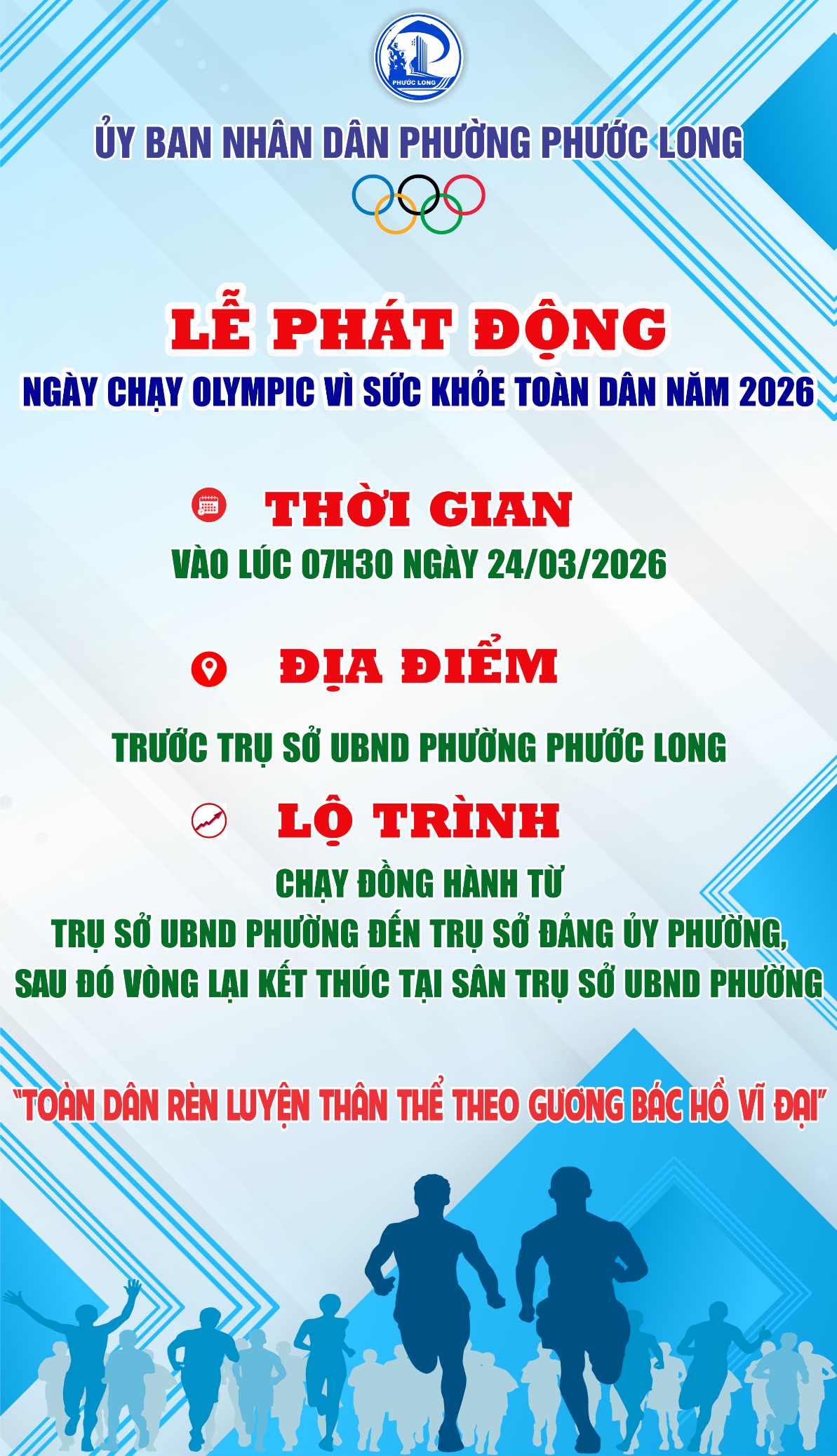 Nhằm thiết thực lập thành tích chào mừng Đại hội đại biểu toàn quốc lần thứ XIV của Đảng, cùng với cuộc bầu cử đại biểu Quốc hội khóa XVI và đại biểu Hội đồng nhân dân các cấp nhiệm kỳ 2026 – 2031, phường Phước Long tổ chức Ngày chạy Olympic vì sức khỏe toàn dân năm 2026.