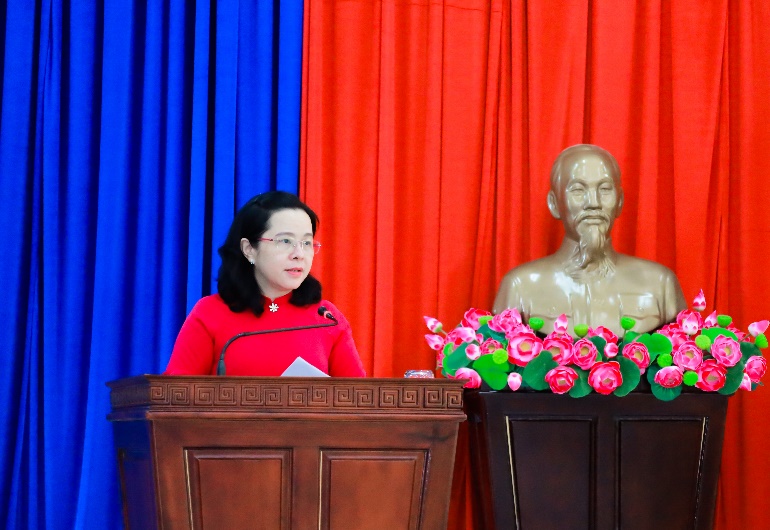 Đồng chí Nguyễn Thị Bảo Thoa - Ủy viên Ban Thường vụ Đảng ủy, Phó Chủ tịch HĐND phường Phước Long khóa II phát biểu tại hội nghị