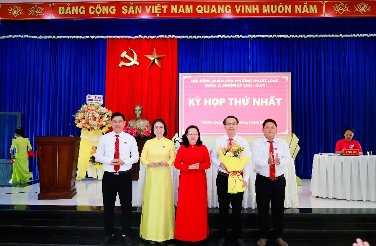 Thường trực HĐND phường Phước Long khóa II nhiệm kỳ 2026-2031 ra mắt, nhận hoa chúc mừng của đồng chí Nguyễn Thị Hương Giang - Tỉnh ủy viên, Bí thư Đảng ủy phường Phước Long