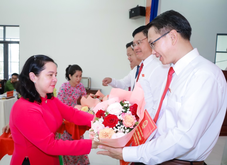 Đồng chí Nguyễn Thị Hương Giang - Tỉnh ủy viên, Bí thư Đảng ủy phường Phước Long trao tặng lẵng hoa chúc mừng