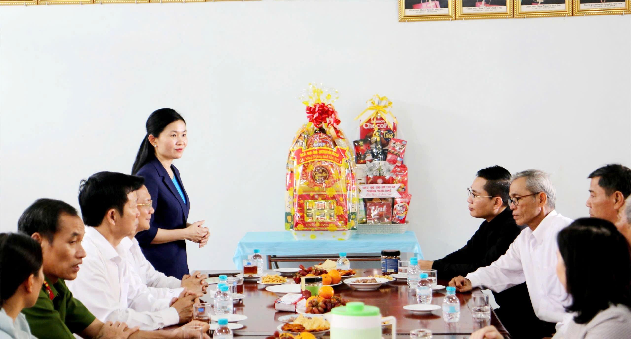 Đ/c Nguyễn Thị Hương Giang, Tỉnh ủy viên, Bí thư Đảng ủy phường Phước Long cùng các thành viên trong đoàn trao quà chúc mừng Giáng sinh đến Linh mục Nguyễn Văn Yến, Quản xứ Giáo xứ Sơn Giang cùng các giáo dân