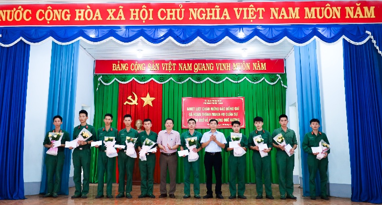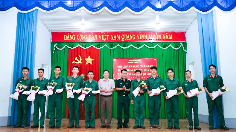 Lãnh đạo UBND phường Phước Long, các Ủy viên Hội đồng NVQS phường trao hoa chúc mừng, phần quà cho các quân nhân và chụp hình lưu niệm