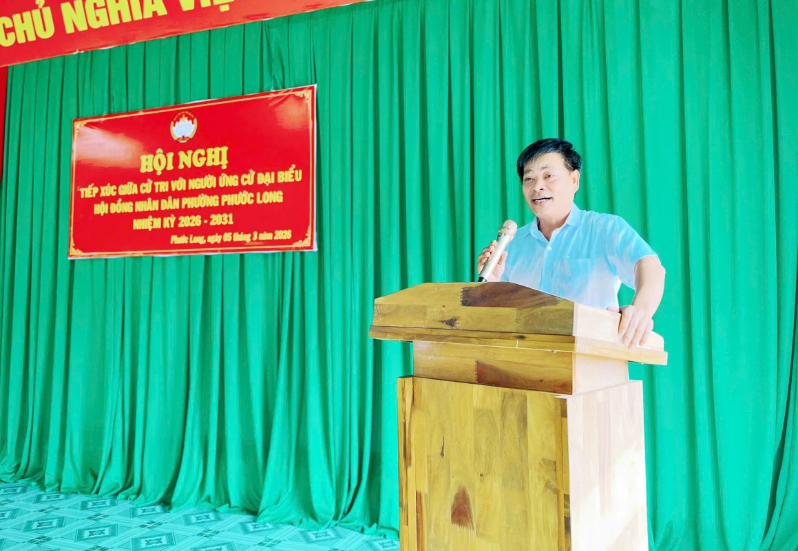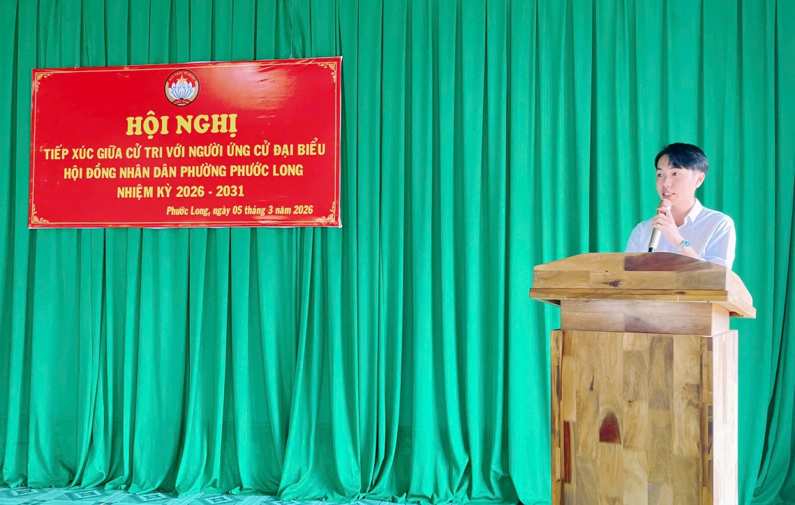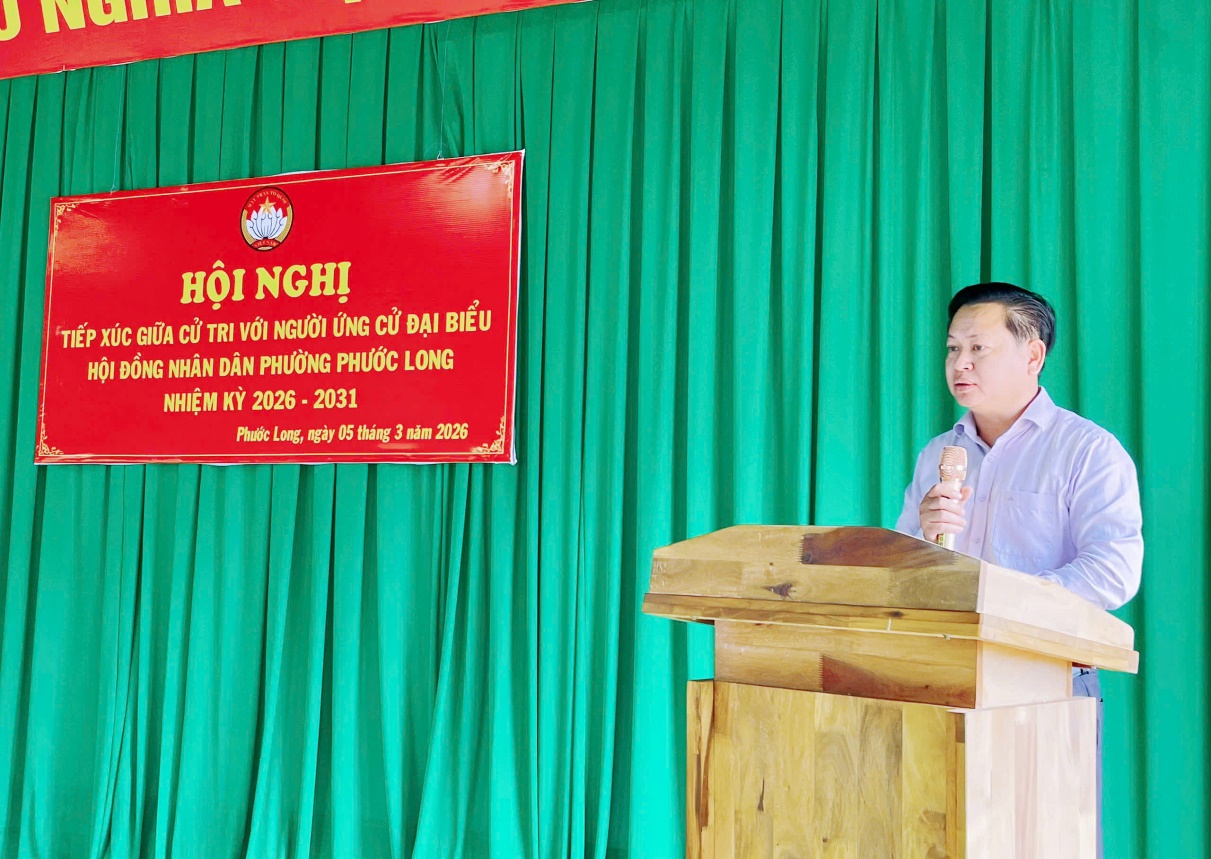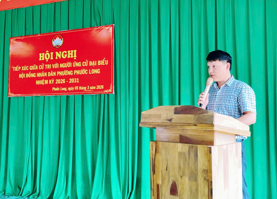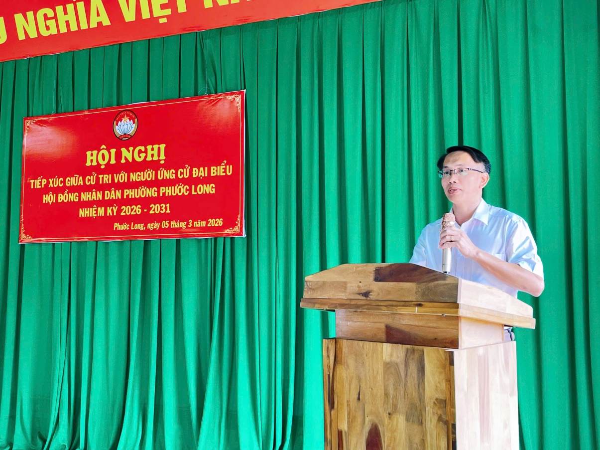 Sáng ngày 05/03/2026, tại Hội trường văn hóa khu phố Phước Thiện, phường Phước Long đã tổ chức Hội nghị tiếp xúc cử tri với các ứng cử viên đại biểu HĐND phường nhiệm kỳ 2026–2031 thuộc đơn vị bầu cử số 5. Hội nghị diễn ra trong không khí dân chủ, cởi mở, thể hiện tinh thần trách nhiệm của cử tri và các ứng cử viên.