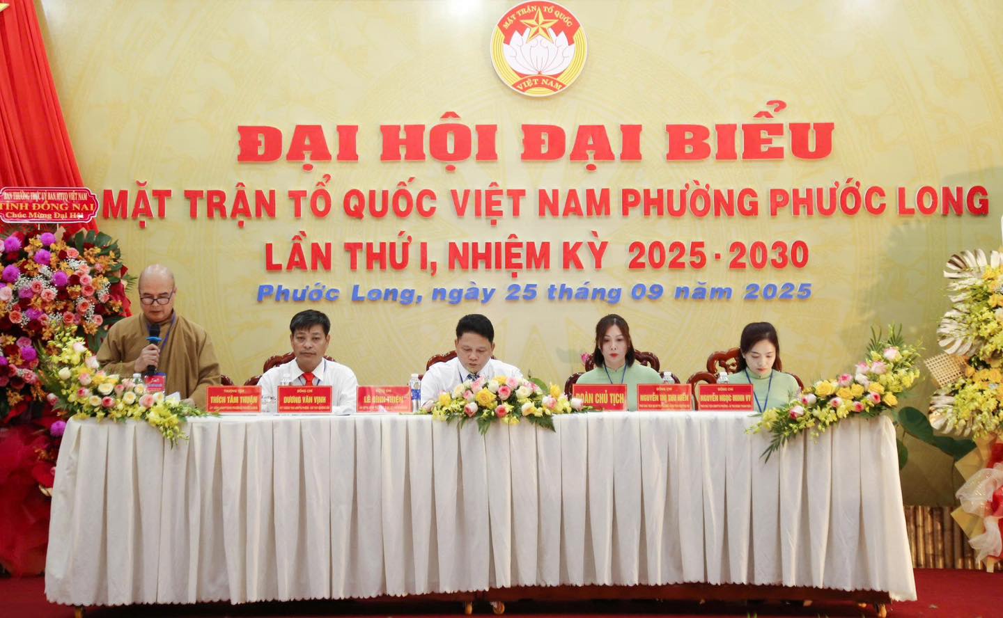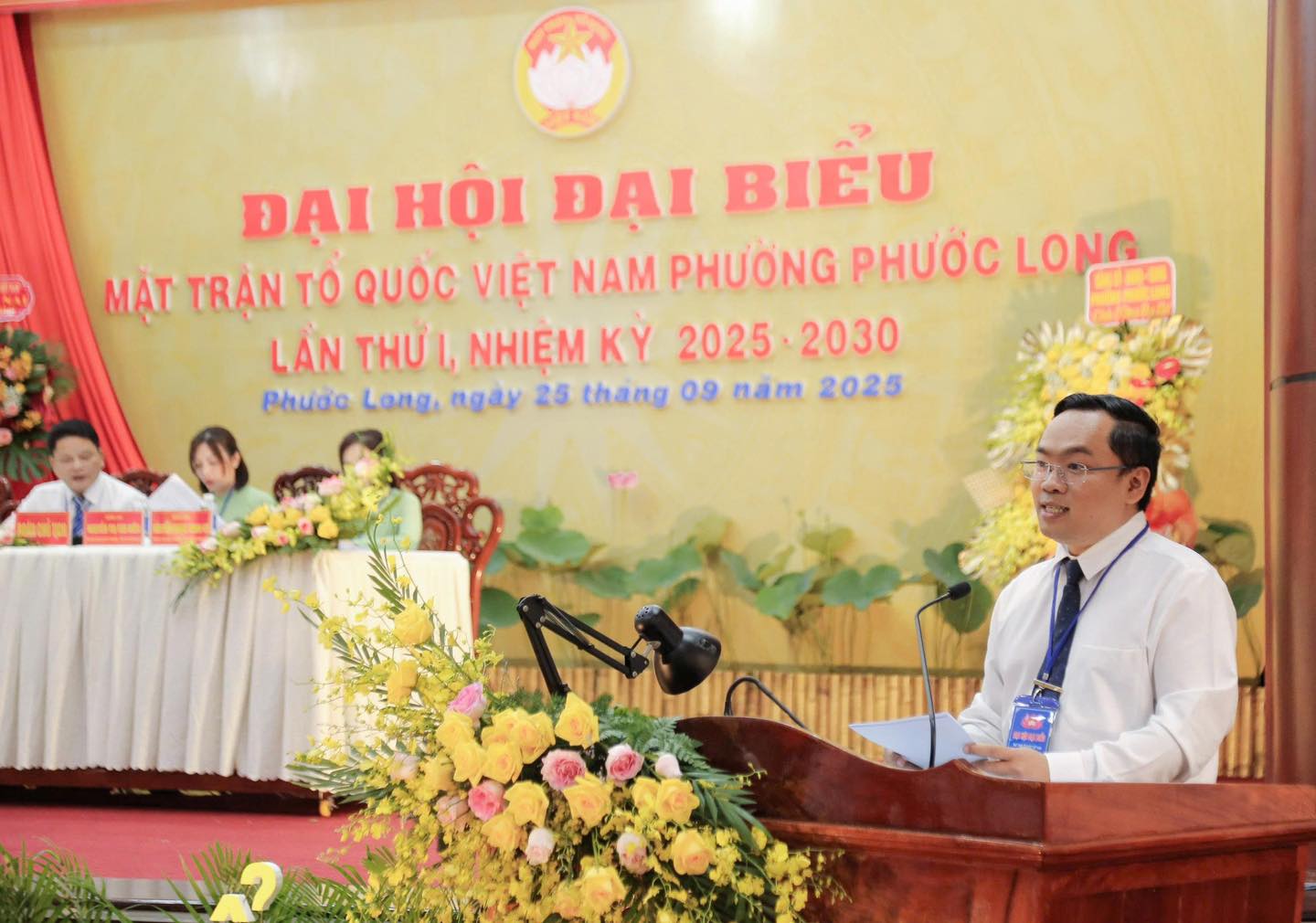 Chiều 25/9/2025, Ủy ban Mặt trận Tổ quốc Việt Nam phường Phước Long, tỉnh Đồng Nai long trọng tổ chức Đại hội đại biểu Mặt trận Tổ quốc Việt Nam phường lần thứ I, nhiệm kỳ 2025 - 2030 (phiên thứ 2 chính thức). Về dự có đồng chí Nguyễn Minh Kiên, Ủy viên BCH Trung ương Đoàn, Tỉnh ủy viên, Phó Chủ tịch Ủy ban Mặt trận Tổ quốc Việt Nam tỉnh, Bí thư Tỉnh Đoàn Đồng Nai, lãnh đạo Đảng ủy – HĐND– UBND–UBMTTQVN phường Phước Long, cơ quan, đơn vị, phòng ban trên địa bàn phường, lãnh đạo Ủy ban Mặt trận Tổ quốc Việt Nam phường Phước Bình, đại biểu khách mời và 160 đại biểu chính thức.