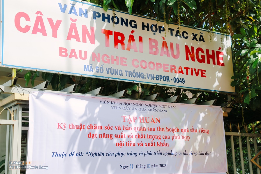 Sáng 31-10-2025, Hội nông dân phường Phước Long phối hợp với Viện cây ăn quả Miền nam (thuộc Viện Khoa học Nông nghiệp Việt Nam), Sở Nông nghiệp và Môi trường tỉnh Đồng Nai tổ chức tập huấn kỹ thuật chăm sóc và bảo quản sau thu sạch quả sầu riêng đạt năng suất, chất lượng cao phù hợp nội tiêu và xuất khẩu cho các thành viên của Hợp tác xã cây ăn trái Bàu Nghé tại Văn phòng của Hợp tác xã.