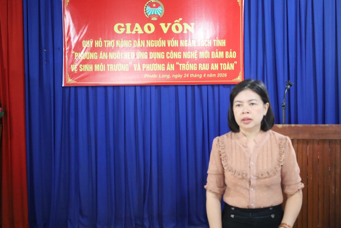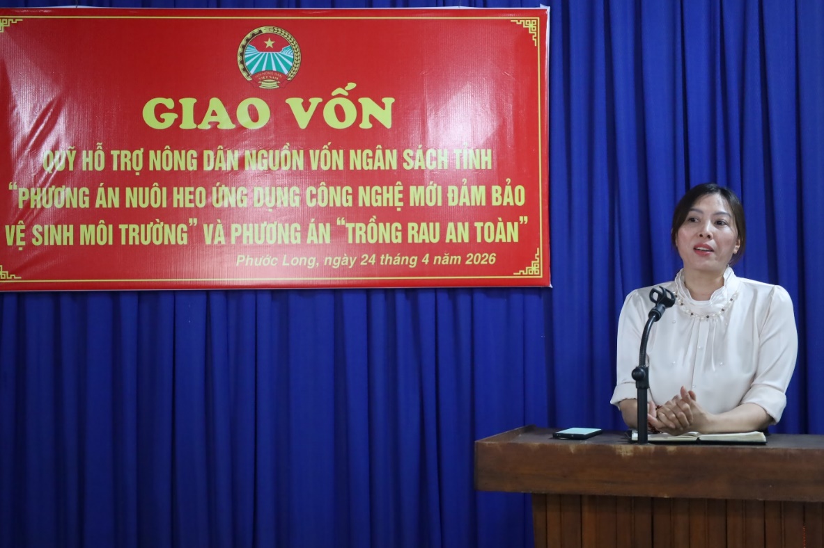 <p style="text-align:justify;">Sáng 24-4-2026, Hội Nông dân tỉnh Đồng Nai phối hợp với Hội Nông dân phường Phước Long tổ chức trao vốn Quỹ Hỗ trợ nông dân cho 20 hội viên tham gia các phương án sản xuất trên địa bàn.</p><p style="text-align:justify;">Tham dự buổi trao vốn, về phía Hội Nông dân tỉnh có bà Lê Thị Thu Hương – Ủy viên Ban Thường vụ, Phó Ban Công tác Nông dân. Về phía địa phương có đồng chí Nguyễn Thị Thu Hiền – Đảng ủy viên, Phó Chủ tịch Ủy ban MTTQ Việt Nam, Chủ tịch Hội Liên hiệp Phụ nữ phường.</p><p style="text-align:justify;">Nguồn vốn được phân bổ cho hai phương án gồm: “Nuôi heo ứng dụng công nghệ mới đảm bảo vệ sinh môi trường” và “Trồng rau an toàn”. Các phương án này nhằm hỗ trợ hội viên nông dân chuyển đổi phương thức sản xuất theo hướng ứng dụng công nghệ, đảm bảo an toàn vệ sinh, giảm chi phí đầu vào, hạn chế sử dụng phân bón và thuốc bảo vệ thực vật hóa học; đồng thời nâng cao chất lượng sản phẩm, đáp ứng nhu cầu thị trường.</p><p style="text-align:justify;">Tại buổi trao vốn, các hội viên bày tỏ sự phấn khởi, tin tưởng nguồn vốn hỗ trợ sẽ giúp có thêm điều kiện đầu tư, phát triển chăn nuôi, trồng trọt theo hướng bền vững, từ đó nâng cao thu nhập và cải thiện đời sống.</p><p style="text-align:justify;">Hoạt động trao vốn không chỉ góp phần hỗ trợ hội viên nông dân phát triển kinh tế gia đình mà còn thúc đẩy xây dựng nền nông nghiệp xanh, an toàn, hướng tới phát triển bền vững trên địa bàn phường Phước Long.</p><p style="text-align:justify;"><strong>X. Niên/Trung tâm DVTH</strong></p><p style="text-align:justify;">&nbsp;</p><p style="text-align:justify;"><img src="https://phuoclong.dongnai.gov.vn/uploads/phuoclong/news/2026_04/image_37.jpeg" width="513" height="318" v:shapes="Picture_x0020_2" uploadprocessed="true" /></p><p style="text-align:justify;"><img src="https://phuoclong.dongnai.gov.vn/uploads/phuoclong/news/2026_04/image_38.jpeg" width="514" height="287" v:shapes="Picture_x0020_3" uploadprocessed="true" /></p><p style="text-align:justify;"><img src="https://phuoclong.dongnai.gov.vn/uploads/phuoclong/news/2026_04/image_40.jpeg" width="517" height="345" v:shapes="Picture_x0020_4" uploadprocessed="true" /></p><p style="text-align:justify;"><img src="https://phuoclong.dongnai.gov.vn/uploads/phuoclong/news/2026_04/image_39.jpeg" width="515" height="344" v:shapes="Picture_x0020_5" uploadprocessed="true" /></p><p style="text-align:justify;"><img src="https://phuoclong.dongnai.gov.vn/uploads/phuoclong/news/2026_04/image_44.jpeg" width="518" height="334" v:shapes="Picture_x0020_6" uploadprocessed="true" /></p><p style="text-align:justify;"><img src="https://phuoclong.dongnai.gov.vn/uploads/phuoclong/news/2026_04/image_41.jpeg" width="513" height="347" v:shapes="Picture_x0020_7" uploadprocessed="true" /></p><p style="text-align:justify;"><img src="https://phuoclong.dongnai.gov.vn/uploads/phuoclong/news/2026_04/image_42.jpeg" width="510" height="320" v:shapes="Picture_x0020_8" uploadprocessed="true" /></p><p style="text-align:justify;"><img src="https://phuoclong.dongnai.gov.vn/uploads/phuoclong/news/2026_04/image_43.jpeg" width="514" height="343" v:shapes="Picture_x0020_9" uploadprocessed="true" /></p><p style="text-align:justify;">Một số hình ảnh tại buổi giao vốn</p><p style="text-align:justify;">&nbsp;</p>