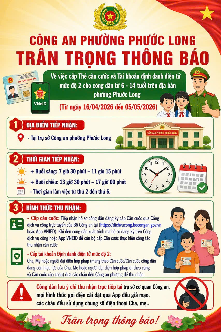 <p style="text-align:center;">CÔNG AN PHƯỜNG PHƯỚC LONG THÔNG BÁO VỀ VIỆC CẤP THẺ CĂN CƯỚC VÀ TÀI KHOẢN ĐỊNH DANH ĐIỆN TỬ MỨC ĐỘ 2</p><figure class="image"><img style="aspect-ratio:853/1280;" src="https://phuoclong.dongnai.gov.vn/uploads/phuoclong/news/2026_04/image_129.png" width="853" height="1280" /></figure>
