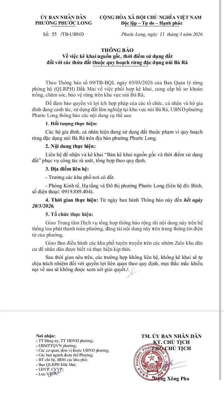 <img alt="THÔNG BÁO Về việc kê khai nguồn gốc, thời điểm sử dụng đất đối với các thửa đất thuộc quy hoạch rừng đặc dụng núi Bà Rá" src="https://phuoclong.dongnai.gov.vn/assets/phuoclong/news/2026_03/z7628286474167_f52f35f1a070fd5611b2ce4d7e58719d.jpg" width="150" class="img-thumbnail" />
