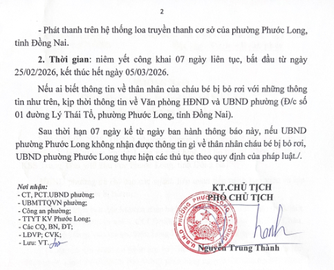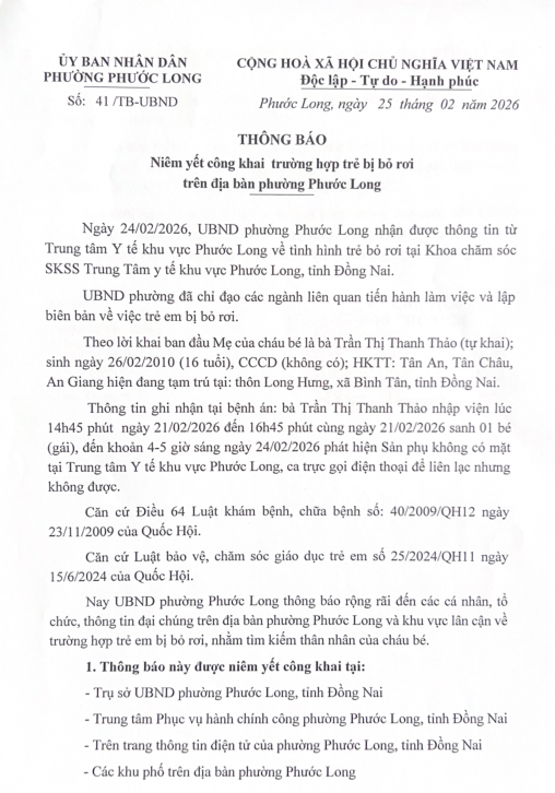 <img alt="SẢN PHỤ BỎ RƠI TRẺ SAU SINH – THÔNG BÁO CỦA UBND PHƯỜNG PHƯỚC LONG" src="https://phuoclong.dongnai.gov.vn/assets/phuoclong/news/2026_02/z7563746708527_69316fdb6ad3fafd2029504f01d5d266.jpg" width="150" class="img-thumbnail" />