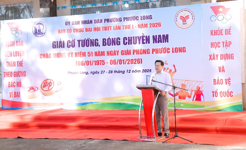 <div style="text-align: justify;"><span style="font-size:14px;">Sáng ngày 28-12-2025, tại Trung tâm Văn hóa – Thể thao (cũ) phường Phước Long đã diễn ra Lễ khai mạc Giải cờ tướng, bóng chuyền nam. Đây là các môn thi đấu nằm trong khuôn khổ Đại hội Thể dục, Thể thao phường Phước Long lần thứ I, năm 2026, đồng thời là hoạt động thiết thực chào mừng Kỷ niệm 51 năm Ngày giải phóng Phước Long (06/01/1975 – 06/01/2026).<br />