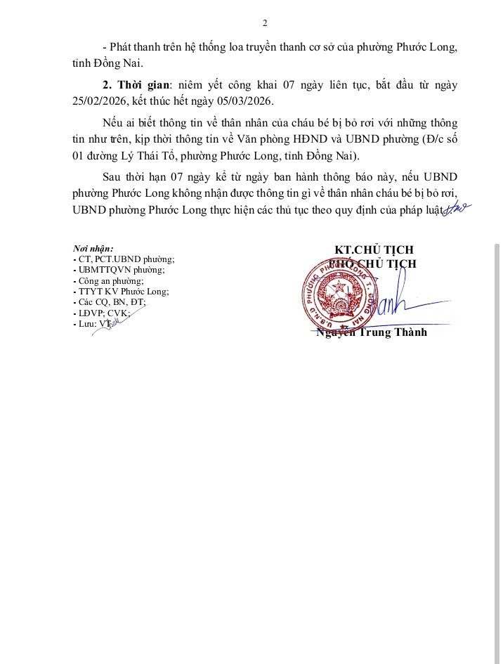 HÔNG BÁO Niêm yết công khai trường hợp trẻ bị bỏ rơi trên địa bàn phường Phước Long