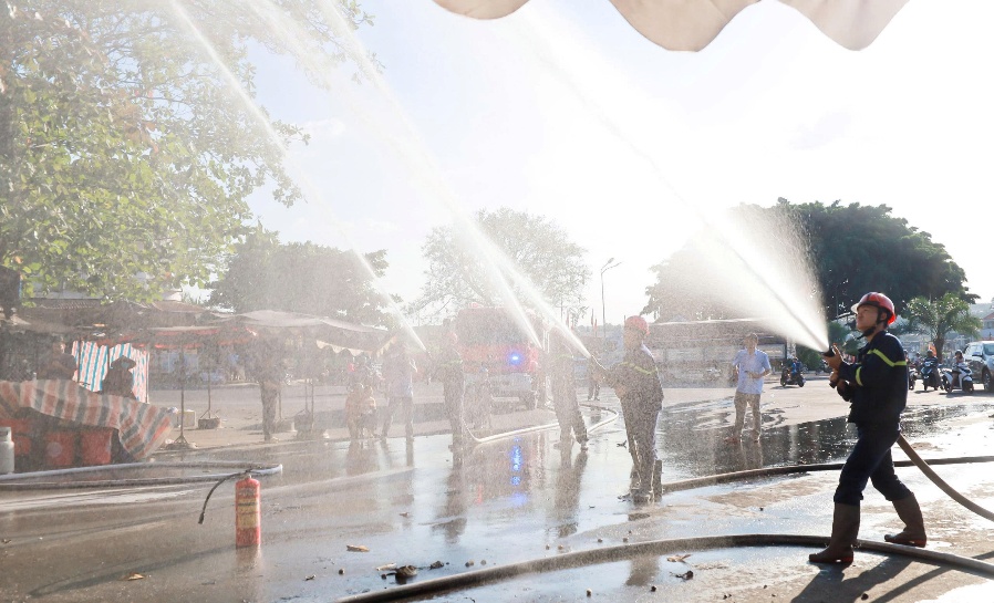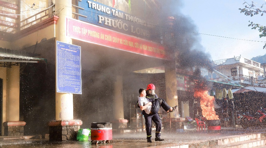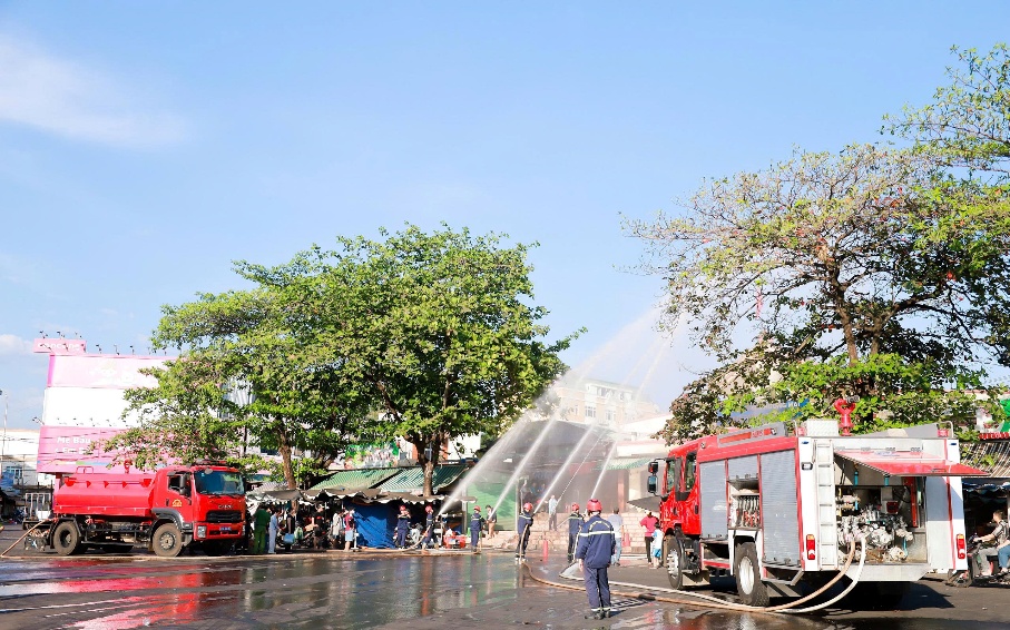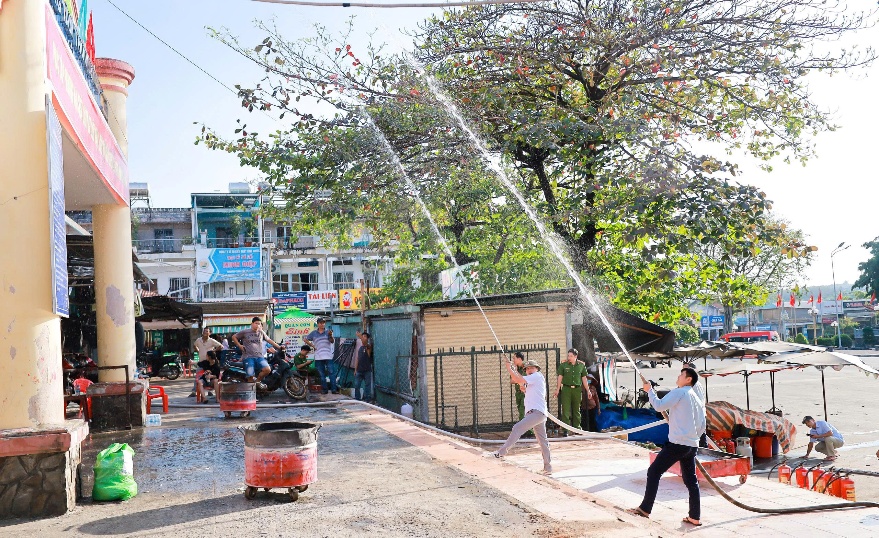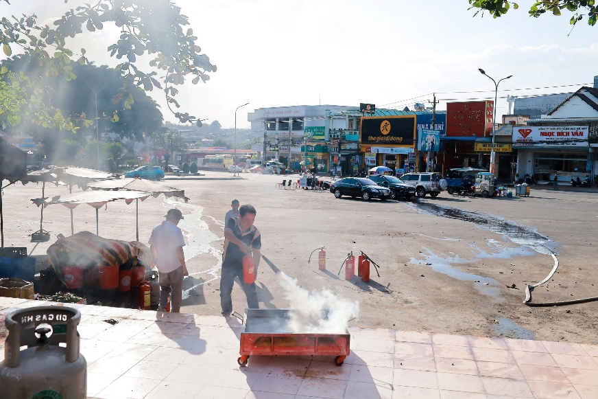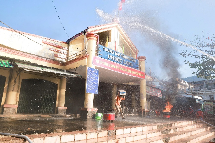 Hình ảnh thực tập và xử lý tình huống giả định “xảy ra cháy tại khu vực kinh doanh trong chợ Phước Long do sự cố hệ thống điện”
