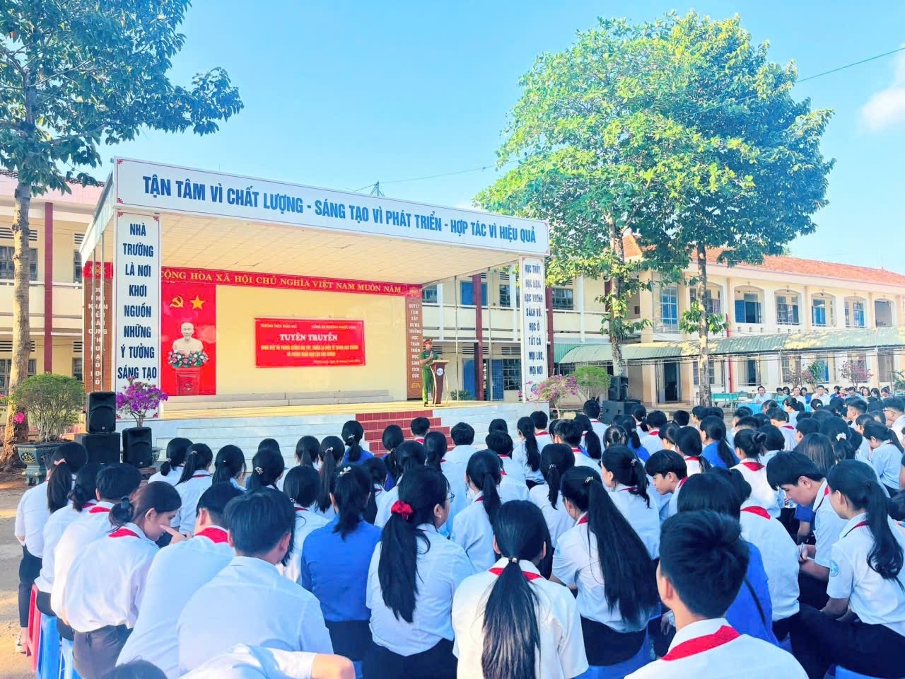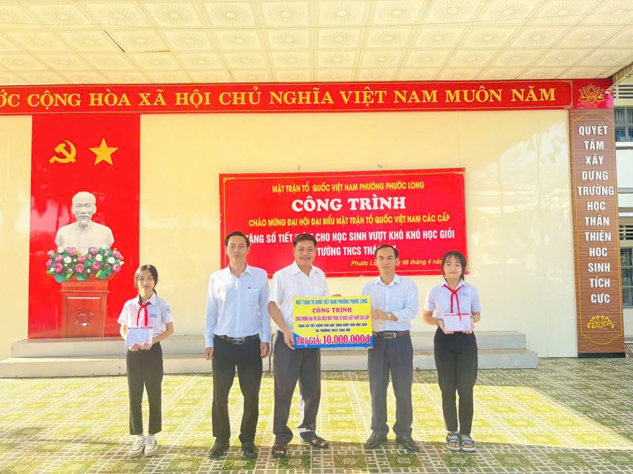 Tại chương trình, đại diện MTTQ phường đã trao 02 sổ tiết kiệm, mỗi sổ trị giá 5.000.000 đồng cho hai em học sinh: em Đinh Ngô Thảo Nhi (lớp 7A1) và em Nguyễn Dương Minh Khuê (lớp 7A6). Cả hai em đều có hoàn cảnh gia đình khó khăn nhưng luôn nỗ lực vươn lên trong học tập, đạt thành tích học sinh giỏi của trường.