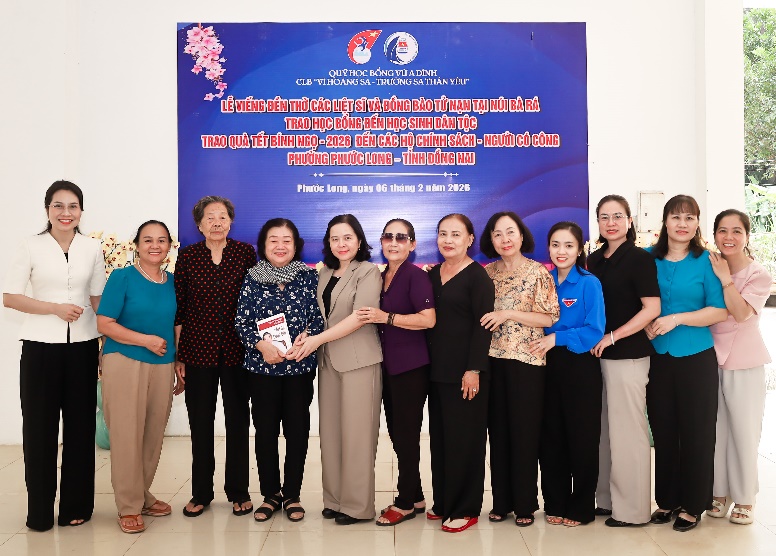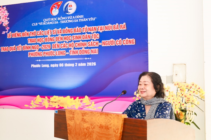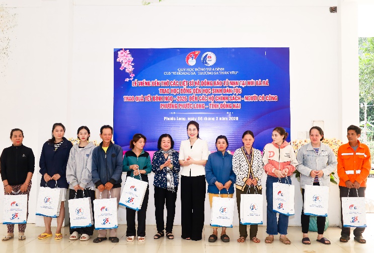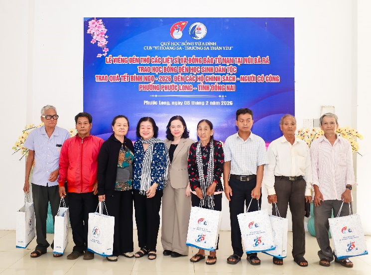Trong chương trình, đồng chí Trương Mỹ Hoa và Đoàn công tác đã dâng hoa, dâng hương tại Đền thờ liệt sĩ và đồng bào tử nạn núi Bà Rá, Nhà bia tưởng niệm trên Đồi Bằng Lăng; đồng thời trao học bổng cho học sinh dân tộc, tặng quà Tết Xuân Bính Ngọ năm 2026 cho các hộ chính sách, người có công trên địa bàn phường Phước Long và khu vực lân cận.