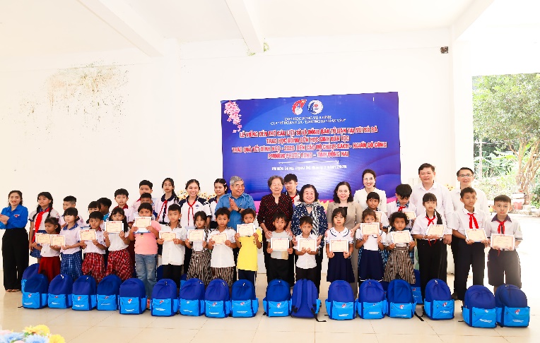 Đồng chí Trương Mỹ Hoa, cùng các đồng chí lãnh đạo, đại biểu tham dự Chương trình đã trao suất học bổng cho học sinh dân tộc và chụp hình lưu niệm