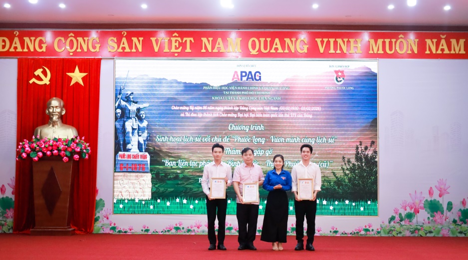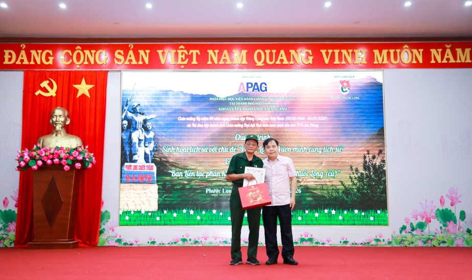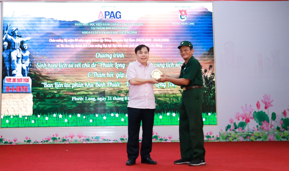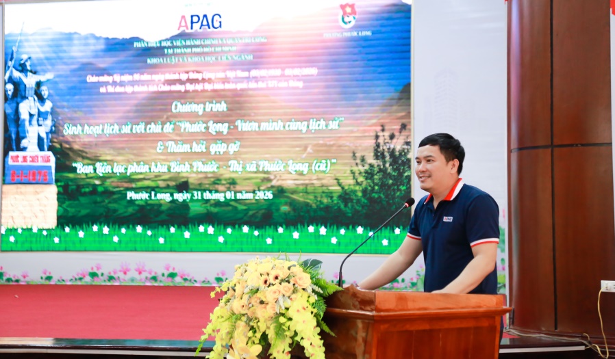 Nằm trong chuỗi hoạt động thiết thực trên địa bàn tỉnh Đồng Nai chào mừng kỷ niệm 96 năm Ngày thành lập Đảng Cộng sản Việt Nam (03/02/1930 – 03/02/2026), thi đua lập thành tích chào mừng Đại hội đại biểu toàn quốc lần thứ XIV của Đảng, sáng 31-1, Khoa Luật và Khoa học liên ngành – Phân hiệu Học viện Hành chính và Quản trị công tại Thành phố Hồ Chí Minh đã tổ chức chương trình sinh hoạt lịch sử với chủ đề “Phước Long – Vươn mình cùng lịch sử” tại phường Phước Long.