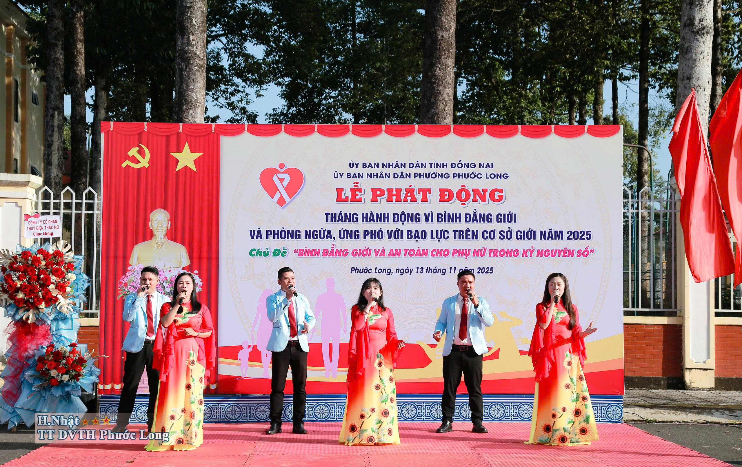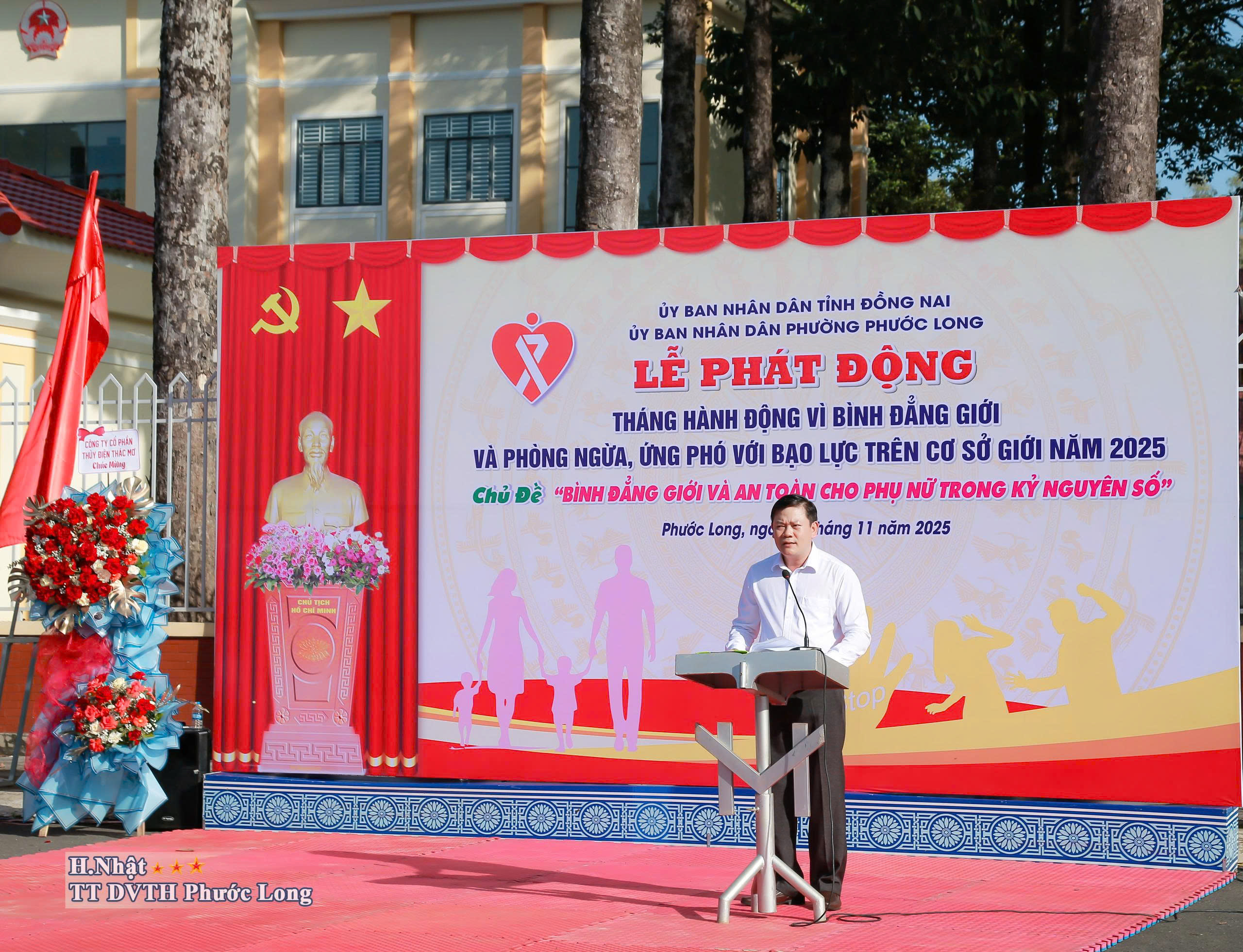 Sáng 13-11, UBND phường Phước Long tổ chức Lễ phát động Tháng hành động vì bình đẳng giới và phòng ngừa, ứng phó với bạo lực trên cơ sở giới năm 2025 với chủ đề “Bình đẳng giới và an toàn cho phụ nữ và trẻ em gái trong kỷ nguyên số”. Ông Nguyễn Khắc Hạnh, Phó Bí thư Đảng ủy, Chủ tịch UBND phường Phước Long dự và phát biểu tại Lễ phát động. Tham dự có bà Nguyễn Thị Bảo Thoa, UVBTV Đảng ủy, Phó Chủ tịch HĐND phường Phước Long, Thượng tá Trương Tuấn Hùng, UVBTV Đảng ủy, Trưởng Công an phường Phước Long, lãnh đạo các cơ quan, đơn vị, phòng, ban, MTTQ và đoàn thể phường, các doanh nghiệp địa phương, cùng đông đảo lực lượng cán bộ, công chức, viên chức, chiến sĩ lực lượng vũ trang, đoàn viên thanh niên và quần chúng Nhân dân phường Phước Long.
