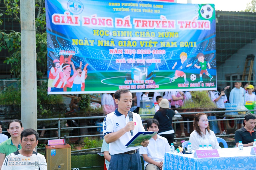 Thầy Vũ Duy Hà, Hiệu trưởng Trường THCS Thác Mơ phát biểu khai mạc cho biết Giải là hoạt động thường niên được trường duy trì và tổ chức hàng năm nhằm thiết thực chào mừng Ngày Nhà giáo Việt Nam 20-11, đồng thời tạo sân chơi vui tươi, bổ ích cho các em học sinh đam mê trái bóng tròn được giao lưu, thi đấu, từ đó góp phần hưởng ứng Cuộc vận động “Toàn dân rèn luyện thân thể theo gương Bác Hồ vĩ đại”, phát triển thể dục, thể thao trong giai đoạn mới theo Kết luận số 70-KL/TW ngày 31/01/2024 của Bộ Chính trị, thúc đẩy hơn nữa phong trào thể dục – thể thao trong nhà trường, phát hiện, bồi dưỡng những em có tố chất, năng khiếu bóng đá cho phường Phước Long tuyển chọn tham gia tranh tài ở tỉnh. Thầy Vũ Duy Hà cảm ơn các Nhà tài trợ Giải đã ủng hộ cho Giải, mong muốn tiếp tục nhận được sự quan tâm, hỗ trợ cho nhiều hoạt động thể dục, thể thao của trường, đề nghị Tổ trọng tài làm việc công tâm, trách nhiệm, các em học sinh thi đấu bằng tất cả khả năng, kỹ thuật của bản thân mang đến sự thành công của Giải năm nay.