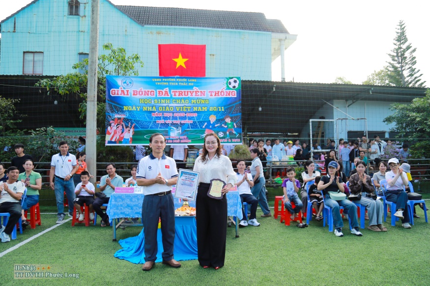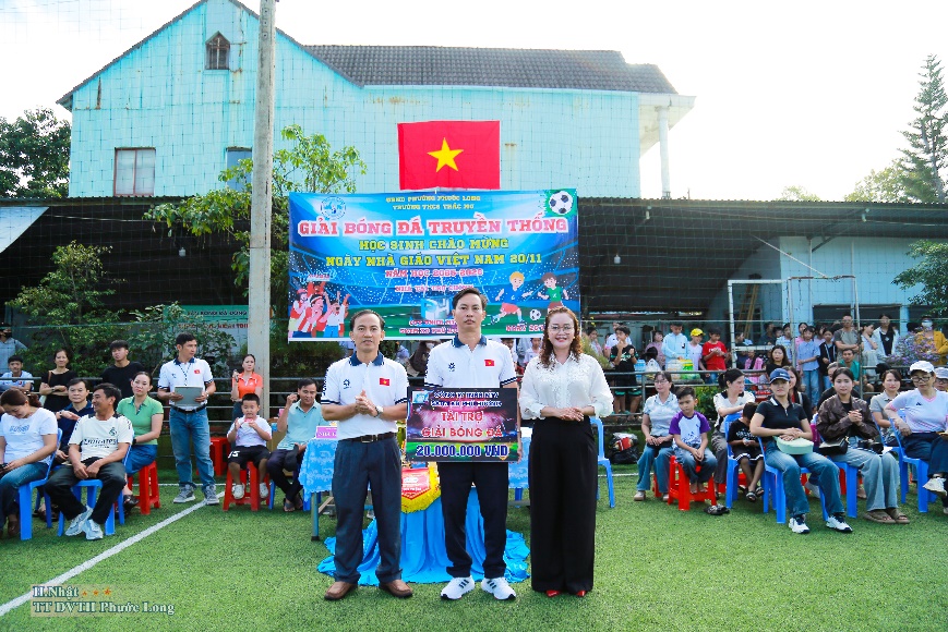 Tại buổi khai mạc, Nhà tài trợ chính Công ty TNHH SXTM xây dựng Phú Hương (phường Phước Bình) trao số tiền ủng hộ 20 triệu đồng. Thầy Vũ Duy Hà, Hiệu trưởng Trường THCS Thác Mơ trao thư cảm ơn, quà lưu niệm đến các Nhà tài trợ chính.