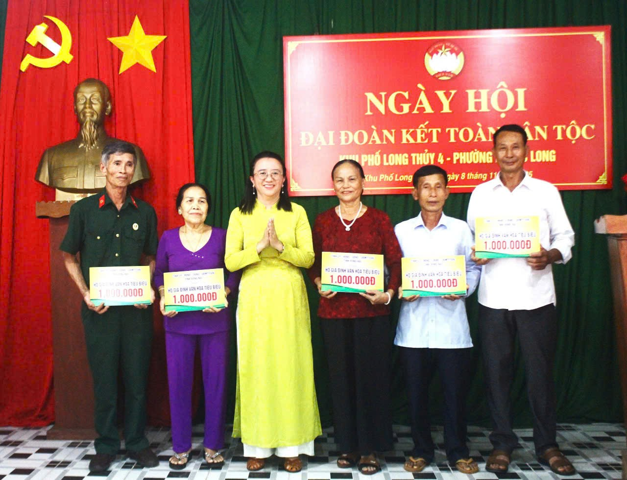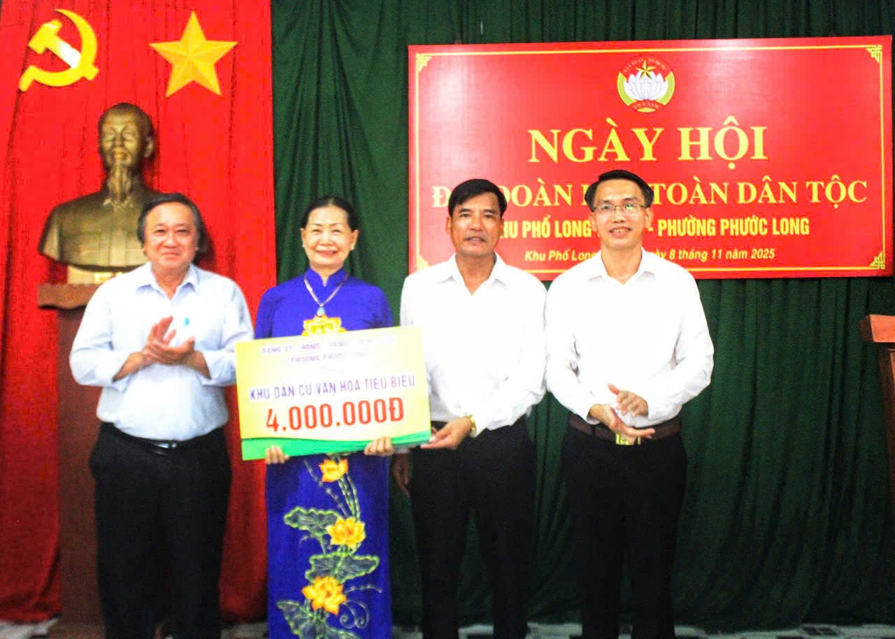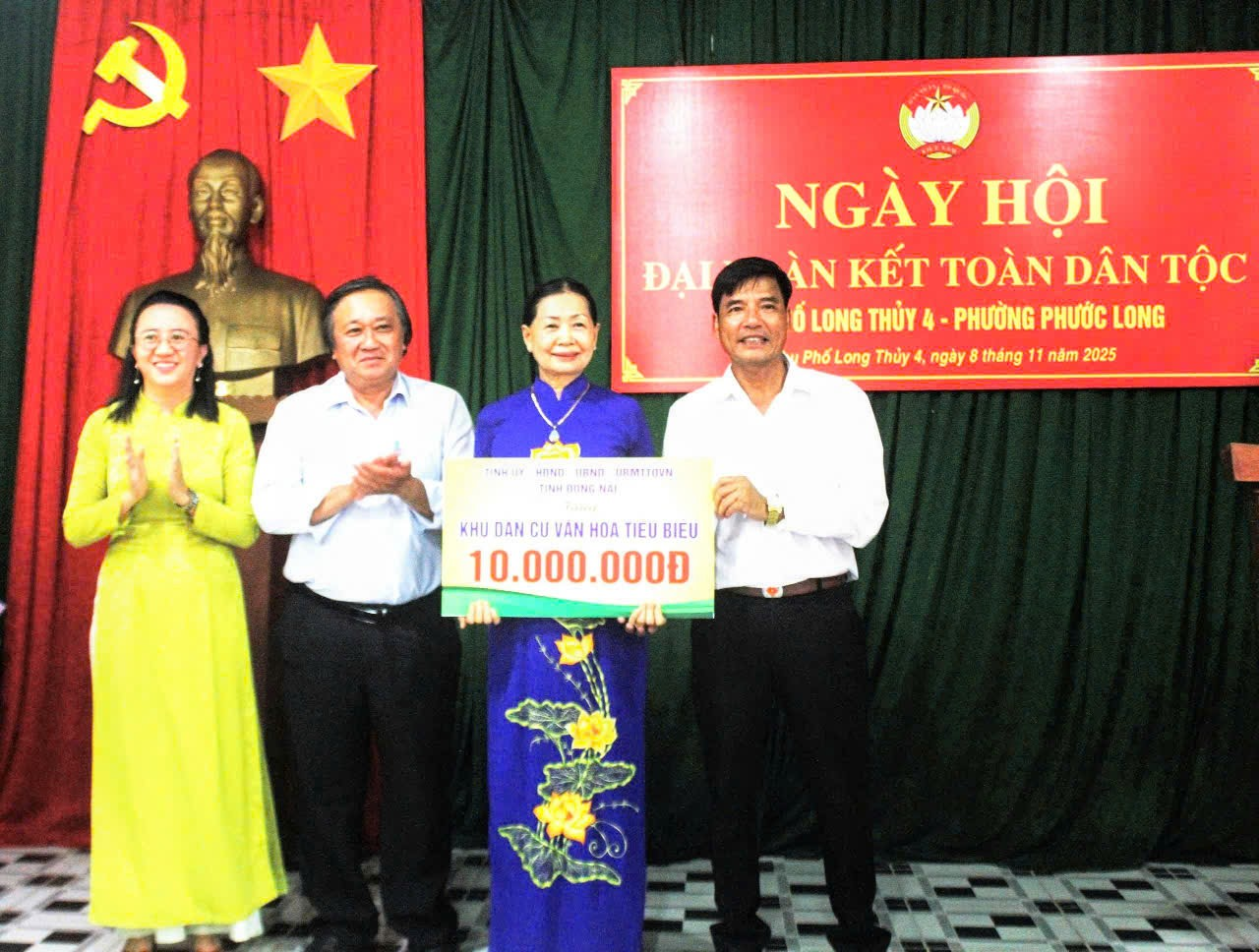 Dịp này, UBMTTQ Việt Nam tỉnh Đồng Nai tuyên dương các gia đình văn hóa tiêu biểu; khu phố Long Thủy 4 được công nhận “Khu phố văn hóa tiêu biểu năm 2025” và nhận quà chúc mừng của Tỉnh ủy, HĐND, UBND, UBMTTQ Việt Nam tỉnh cùng lãnh đạo phường Phước Long.