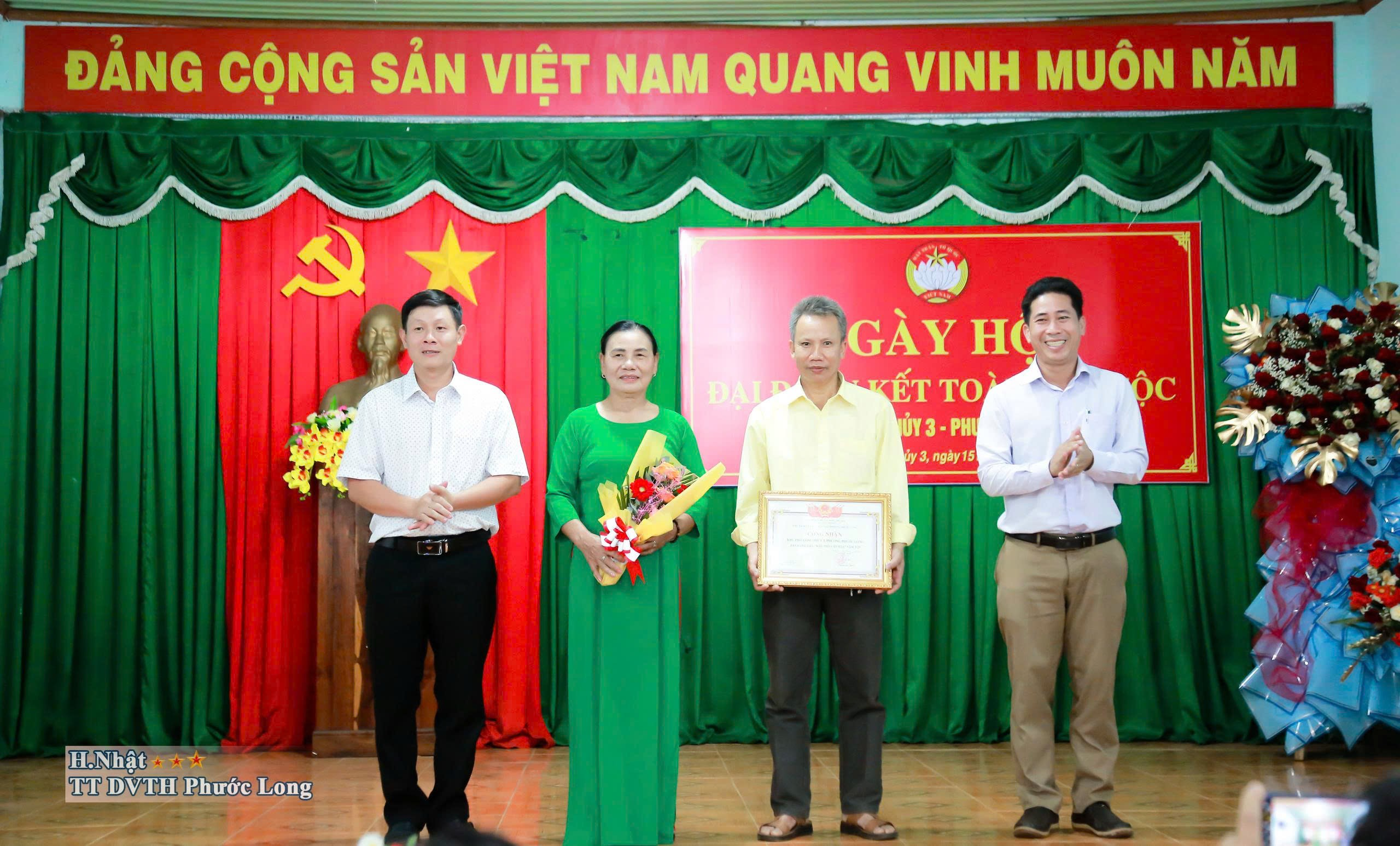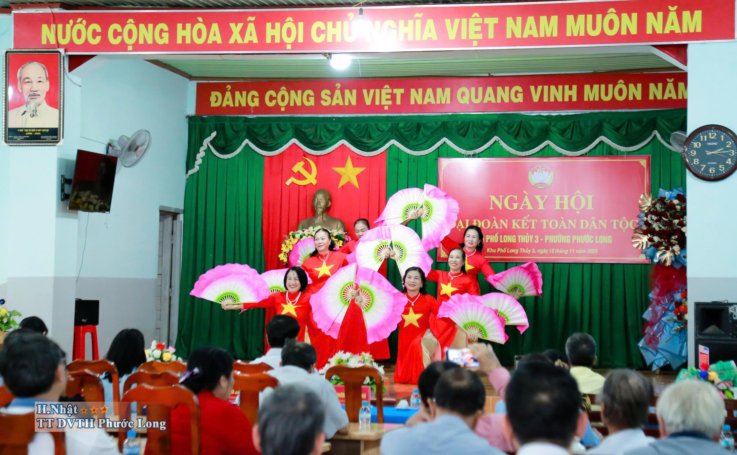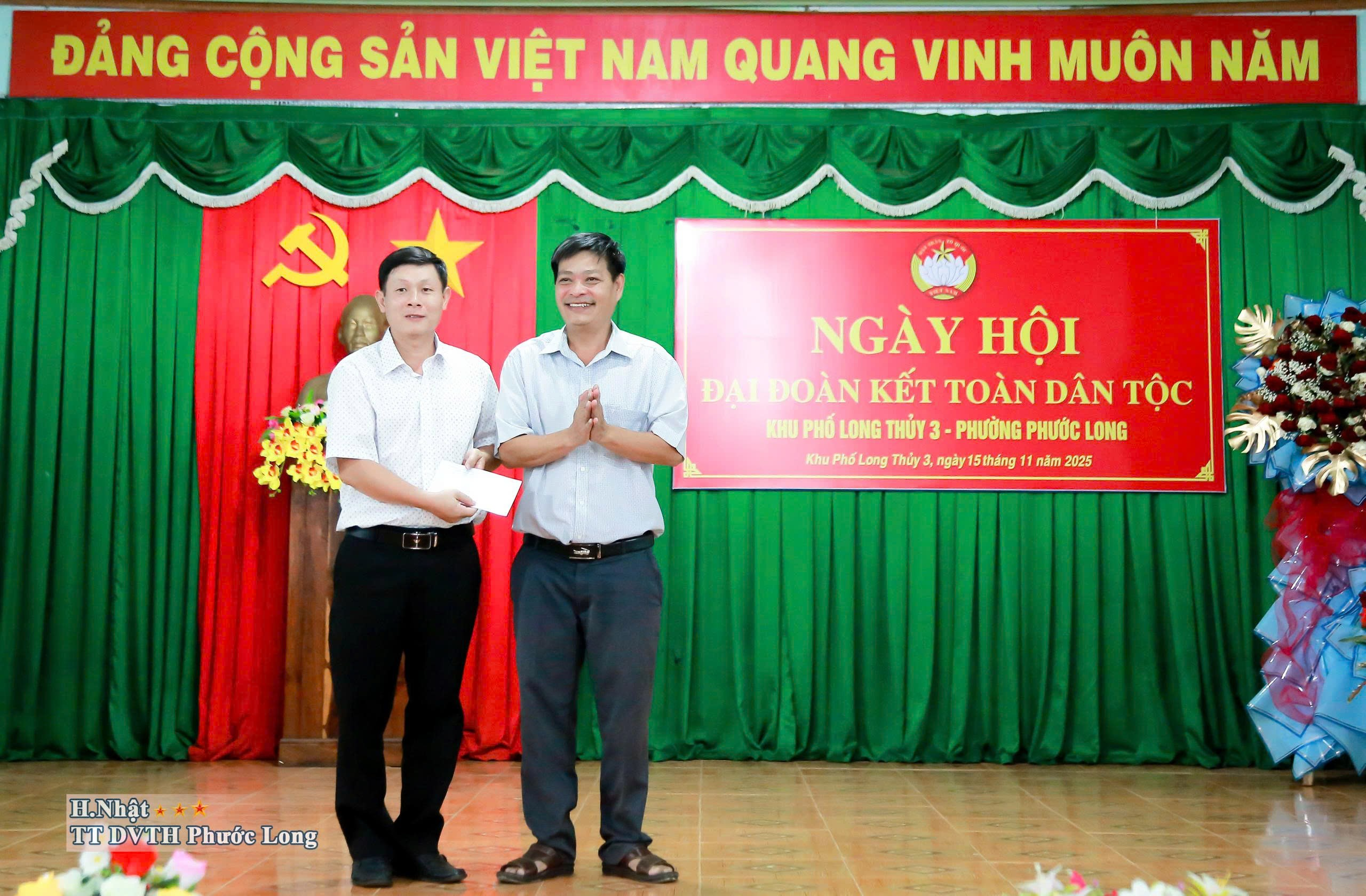 Chiều 15-11, Tỉnh ủy viên, Bí thư Đảng ủy phường Phước Long Nguyễn Thị Hương Giang đã về dự, chung vui và phát biểu tại Ngày hội đại đoàn kết toàn dân tộc khu phố Long Thủy 3 năm 2025. Tham dự có ông Dương Văn Vịnh, ĐUV, Phó Chủ tịch Thường trực UBMTTQVN, Chủ tịch Hội nông dân phường Phước Long, bà Đỗ Thị Hồng Minh, Phó Trưởng Công an phường, ông Cao Thanh Điềm, Phó trưởng Phòng Kinh tế, Hạ tầng và Đô thị phường Phước Long, cùng đông đảo cán bộ, đảng viên và Nhân dân khu phố.